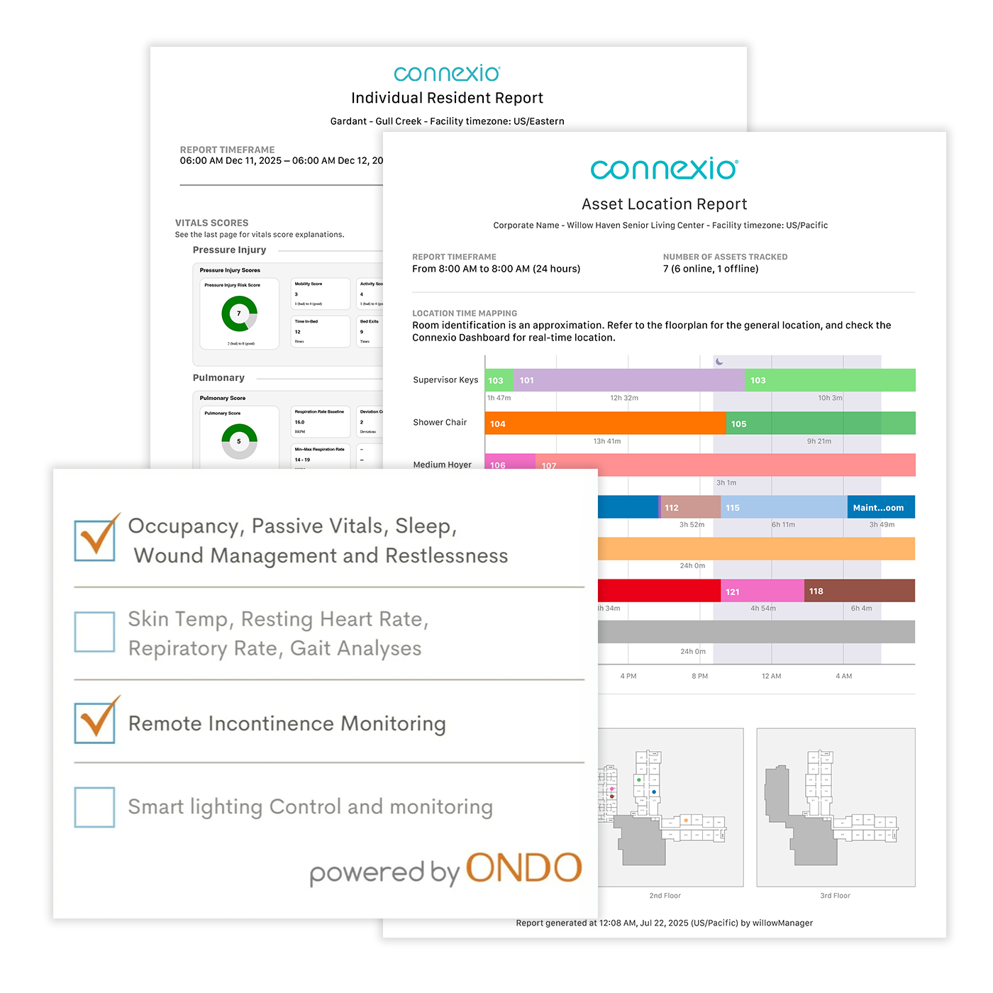 Connexio integrates with leading sensor developers, medical equipment manufacturers, and EHRs, creating data-rich workflows across skilled nursing, rehabilitation, memory care, assisted living, and home care environments.