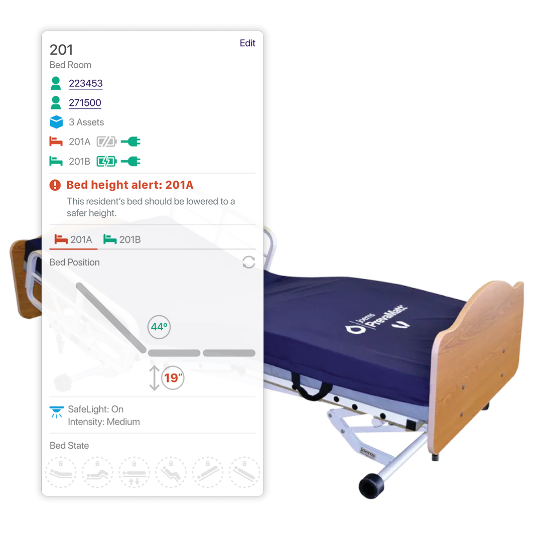 Track bed occupancy, bed exits, and restlessness and receive individualized fall risk and pressure injury scoring for each resident.